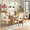 The Lifestorey 5-Piece Blakely Dining Set has a sleek, contemporary design with unique details. The table is defined by a thick top (33mm) and elliptical-shaped legs, which add stability and visual interest. On the bottom of the legs, adjustable levelers make it easy to adjust the height of either leg to accommodate uneven floors. The dining chairs feature high chairbacks for added comfort and an eye-catching keyhole effect at the bottom. Seats and backs are generously cushioned and upholstered with a linen-like fabric in a beige color. Table and chair legs feature a weathered light oak finish for a natural, organic aesthetic. Chairs and table legs are made of solid rubberwood. Tabletop is MDF with beautiful oak veneers. Set includes table and 4 chairs.