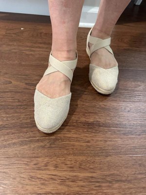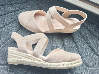 Get that now-trending nautical look in these comfortable and classic women’s espadrille wedges. Designed with a canvas fabric upper, almond toe, slip-on fit, crisscrossing stretch gore straps for easy on/off, and jute-wrapped wedge heel. Linings crafted from partially recycled materials.