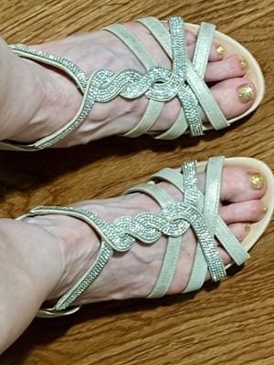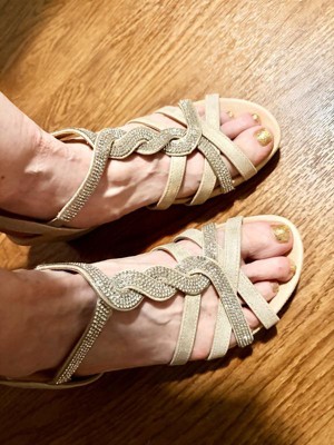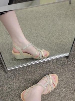Celebrate everyday moments and special moments in these sparkly women’s wedges. Wedge sandals designed with faux leather, interwoven straps with rhinestone accents, and an easy slip-on fit with built-in stretch.