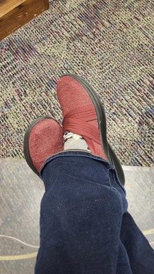 So comfy I am buying another pair (or maybe 2). Fits perfectly and the red goes with more than you think. Love the subtle sparkle. A tiny bit wide for my barely medium feet but still fit great.
