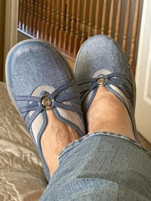 I already owned the black shoes in this style. The denim version works well for both casual jeans or skirts. I can also use them with longer pants or dresses. Since so many shoes have gone to synthetic over leather, I have found Bzees to be a great alternative. I check all sales and love the discounts. They are a little wide but still feel great.