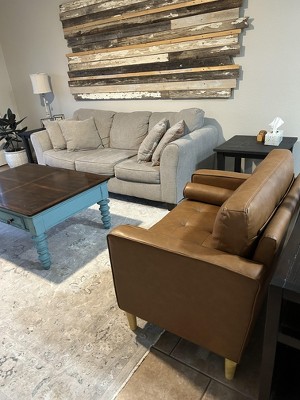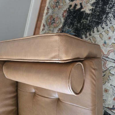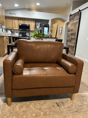 Style has never been so sweet! The Giovanni sofa set’s rich caramel-colored vegan leather upholstery instantly draws the eye, and the simple assembly ensures that you can start enjoying it right away. The cushions are packed with high density foam and pocket coils, while the cylindrical throw pillows provide flair as well as added support. The light wood legs support a solid hardwood frame, creating a durable set to serve as the centerpiece of your living space.