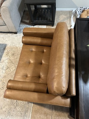 - Upholstered in a warm brown vegan leather