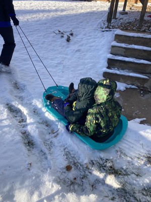[This review was collected as part of a promotion.] I have two of these sleds. They are very solid and stable- perfect for my 4 and 7 year old. They are big enough to comfortably fit an adult and a child if you want to join the fun too. I like that they come with a good quality rope already attached. We have sure put these sleds to the test this year. These sleds have gone off jumps and even had a high speed accidental collision with a playset post- both the child and the sled were undamaged! It's such a perfect year to have one of these sleds! We've had hours of fun already, and there is more to come for sure!