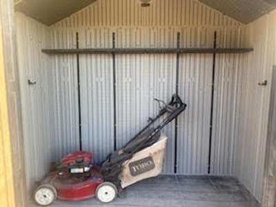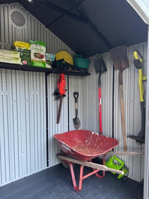 [This review was collected as part of a promotion.] I needed to free up some room in my garage and have a dedicated space in the backyard for my lawn tools and gardening supplies. This Lifetime 8' x 5' shed is the perfect size to hold everything. We started off by building a level wooden foundation using the easy to follow instructions that were included. The instructions for building the shed were detailed, illustrated and all the parts labeled. I was able to do most of the building myself until it came to putting up the walls and roof, when you will need one person to hold the walls or roof panels in place while the other person screws them together. We gave about 18" of clearance behind the shed that came in handy to place a ladder when installing the roof panels. It came with a long shelf that installs across the back wall and 6 hooks for hanging your tools. The natural light from the door windows and skylights make it easy to find what you need during the day. We have experienced several weeks of rain since building this shed a few months ago and have not seen any indication of water inside the shed. Overall, I am very pleased with this attractive, durable, high quality shed and look forward to a lifetime of use.