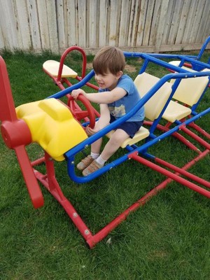 Time to clear the runway for takeoff! Fuel your child's inner pilot with the Lifetime Ace Flyer Teeter-Totter. This unique aviation-themed playset offers kids tons of ways to play whether they’re enjoying outdoor time to themselves or getting together with friends and siblings. Ride on the wings for an up-and-down action, or in the cockpit for a side-to-side movement. The Ace Flyer Teeter-Totter will set their imaginations soaring as they work the controls on the dashboard, spin the propeller, and steer their plane through the big blue sky. With a seven-child capacity and durable construction, all the kids can get together to play for hours. You can enjoy the security and low maintenance of a powder-coated steel frame and high-density polyethylene panels, which are UV and weather resistant, so they won’t fade, rust, rot, or splinter. Provide fun for the whole neighborhood without taking up the entire yard—this playset is compact and occupies an efficient footprint while supporting play for up to seven kids. With no staining, painting, digging, or foundation required, your family can enjoy years of fun without the hassle and maintenance of a wooden playset. The Ace Flyer Teeter-Totter is built for safety and exceeds all playground performance and safety standards.
