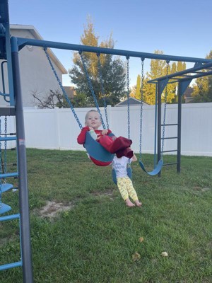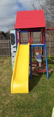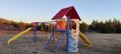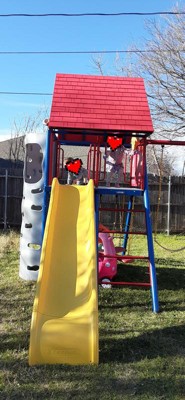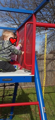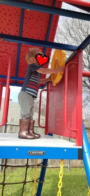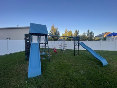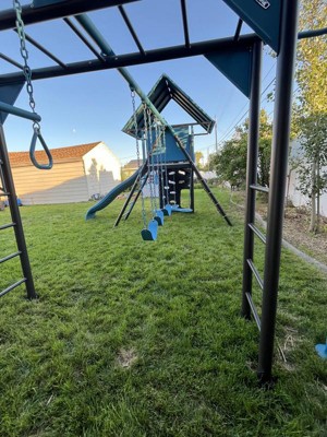Oh my heck, we are so excited! We put our lifetime playground together and love the way it looks, the colors are awesome. Putting it together became a family event, directions were pretty straight forward, hardest part was finding where we wanted to put it in the yard and also the wasp sting we may have encountered (wasps not included!). So far the kiddos like what they call the “hideout” underneath the slide but have been enjoying the whole playground. We are very excited to have family over to share some fun with all the nieces and nephews/cousins. Big stuff deluxe playset in Jay Blue