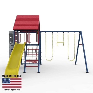 Give your kids the playset they’ll cherish for years and make lasting memories on—the Lifetime Big Stuff Swing Set is a complete play system with all the features that families need for enriching, safe, and diverse fun. Children can imagine new worlds inside their very own clubhouse with a hardtop roof, and have active and exciting fun on the trapeze bar and double swings. A 9-foot wavy slide makes your own backyard a playground at home, and a ship’s wheel and binoculars in the club playhouse give kids the tools to let their imaginations run wild. With a side climbing wall and rope ladder, there’s something for kids of all ages to play on and enjoy. The Big Stuff Swing Set is made for safety and low maintenance—it is built with zero lead-based materials, features rounded edges or plastic caps on corners, and exceeds all Playground Performance and Safety Standards. This home playset is free standing which requires no cement. It needs no painting or staining, and is made with all-weather resistant and UV-protected material. The playset won’t crack, warp, rot, or splinter, and it will maintain its strength and color. Exceptionally strong powder-coated and galvanized steel will prevent rust and ensure integrity and durability. The Lifetime Big Stuff Swing Set is a play system that gives children everything they need for endless fun and parents the safety and low maintenance they can enjoy.