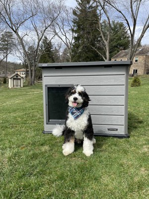 We are so in love with our new doghouse. I have 2 mini-Australian shepherds who are 30 lbs each. They both fit nicely in the house. One of the features we were most excited about was the material the house is made out of. The idea that it won’t rot and won’t need to be repainted like our wooden backyard fence is amazing! I was also pleased with the quality of the clear door. The door was the perfect thickness to keep closed with a little wind and also light enough the dogs had no problem pushing it to get through. I also really appreciate that the roof opens. This makes it easy to clean and also easy to see the pups if they decide they don’t want to come out. If you are looking for a backyard dog house, this is the perfect choice.