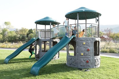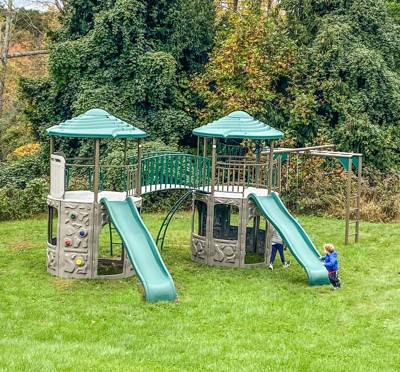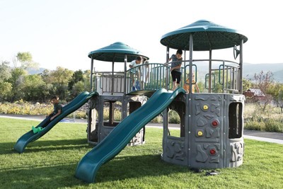 [This review was collected as part of a promotion.] My kids absolutely LOVE this playset! The double towers are perfect for our 5 kids. The colors are pretty neutral and look great in the yard (which mom really likes!) My oldest loves the rock wall, and both the big kids and littles love the slides. This playset is sturdy and substantial, and the perfect fun addition to our farm!