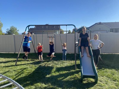 A: This Play set is recommended for children ages 3-12. However, we hesitate to give exact ages as children come in all sizes. Each swing has a weight capacity of 150 pounds and the slide also has a weight capacity of 150 pounds. The platform has a weight capacity of 600 pounds, so even adults can join in on the fun!