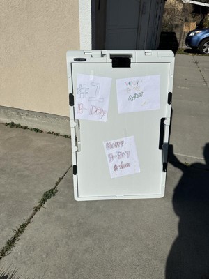 [This review was collected as part of a promotion.] I just got the sidewalk sign from Lifetime Products and overall, I’m really happy with it. It’s extremely durable, and I love that it can be filled to weigh it down—great for windy days. The design feels sturdy and long-lasting. I do have a couple of small wishes. The black clips that fold down to hold the sign in place work well, but I wish they were clear so they wouldn’t cover any part of my display. Also, I’m 5'3", and once my sign is mounted, it covers the side handles that’s meant for carrying. Because of that, I’m forced to use the top handle, which is a bit awkward since the stand is about 38" tall. It’s manageable if I don’t have to move it far, but I’m worried that once I add sand for weight, it might become harder to move without modifying my sign. I may have to cut small holes so the side handles are accessible. All that said, I’m honestly in love with this sign. Since putting it out, my business has increased by about 80% this week—it’s definitely catching the attention of people driving by my house. For the durability and visibility alone, it’s been absolutely worth it.