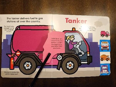 My 13-month old who loves loves loves trucks got this for his birthday a month ago and reads this MANY times a day. Nice truck facts to read aloud on each page and durable flaps that he loves to open. Tabbed pages are easy for him to turn. You can open the door flap on each truck to see the driver (one truck has a female driver!) and an additional flap to see a different part of the truck.