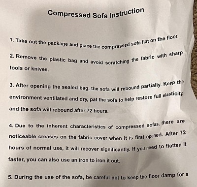 Sofa arrived shrink wrapped. It’s supposed to partially expand after unwrapping. It didn’t budge. It’s unusable and hard as a brick. Will be returning.
