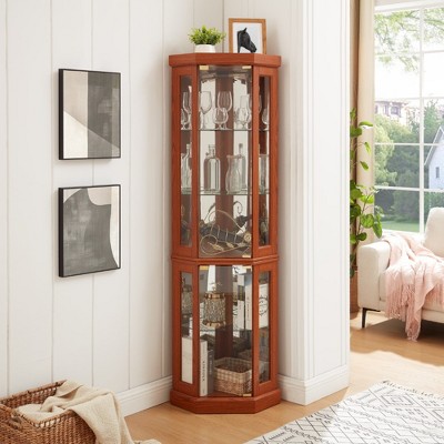 Lighted Corner Curio Cabinet, Glass Display Case with Mirror Back, Antique Bar Storage for Dining Room