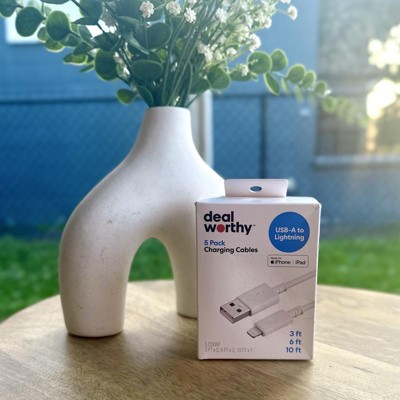 I really like this 5 pack of Dealworthy USB-A to Lightning Cables. The quality is very good and they have all held up well for my family. I especially like the 10 ft cable. The cable is thicker than the shorter cables so it is a bit heavier and sturdy. This pack includes 5 cables as follows: 3'/3'/6'/6'/10'. We use the shorter cables on a shelf charging station for our kids. The 6’ cables work great while sitting down near a USB outlet, and the 10’ is great when you need a longer cable. These are great quality chargers and they charge our Apple devices quickly. I would highly recommend them!