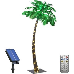 Bring a touch of nature to your space with this lifelike palm tree, featuring a realistic curved metal trunk and natural fabric leaves for an authentic look. The solar-powered design is energy-efficient and includes a USB charging option (adapter not included) for cloudy days. Built with a sturdy metal base and ground stakes, it ensures stability for both indoor and outdoor use. Perfect for year-round décor, it adds a tropical vibe or festive charm to any setting—ideal for homes, gardens, patios, and commercial spaces. A low-maintenance, eye-catching accent for any occasion!