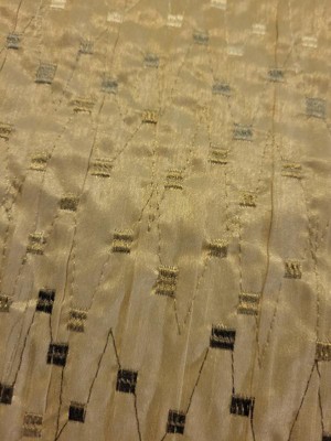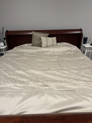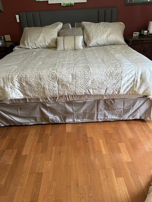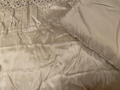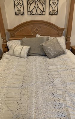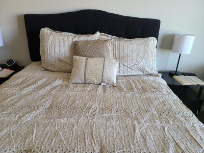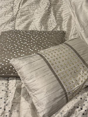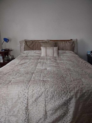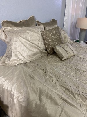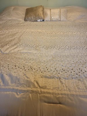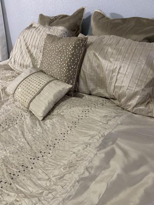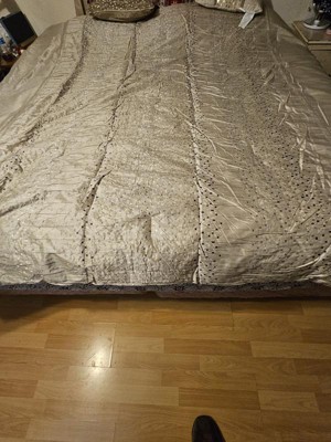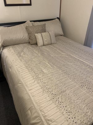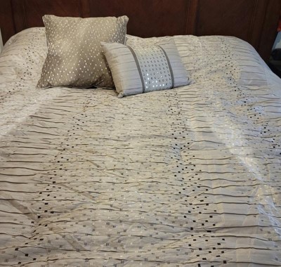 [This review was collected as part of a promotion.] This comforter set is just gorgeous. It has a textured pattern with natural golden and silver tones that would fit with almost any color scheme. However, overall quality could be improved. As threads dangled from the sides and top of the comforter, and some of the pleats came undone as I tried to smooth it out. I would recommend ordering a size larger for this comforter set. I received it in a king size, and it fits well on my queen-size bed. Overall, I will say that the design is beautiful, although there are a few little things that could be fixed.