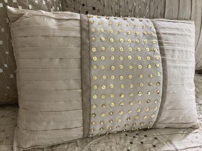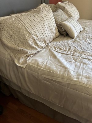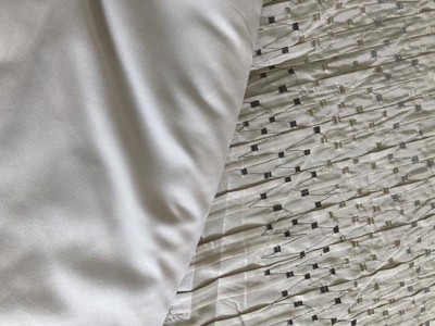[This review was collected as part of a promotion.] I really like this set. Most pieces have nice details such as pleats and embroidery. The included pillows are a good size and are nicely finished, one covered with embroidery and the other with pleats and some sequins. I like the neutral colors - the embroidery thread ranges from grey to silver to gold. The reverse side of the comforter is a solid color. It is a good medium weight and is finished well. I was happy to find an embroidered set that is not too traditional looking. Note that two of the shams are for Euro sized pillows at 26” x 26”. The skirt matches the euro shams and is tailored.