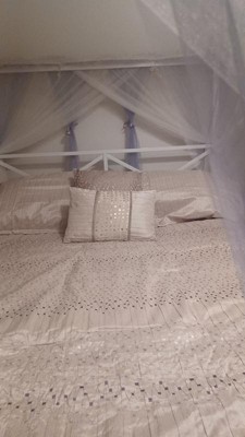 [This review was collected as part of a promotion.] We go this set for the guest room. It has an interesting pattern, and a decorative top. The top fabric is a blend so the embroidery looks the same even after the bed has been slept in. The 8 pieces are the embroidered comforter, bed skirt, 4 pillow cases, and two throw pillows. The bed looks complete and the set is mostly for show. The comforter is light-weight but warm. The underside is a thin cotton fabric that is soft to the touch. The outside is a blend that is noticeably rougher. I was not impressed with how the outside feels against bare skin. The pillows cases and throw pillows are mainly decorative. I opted to not use the two large square pillow cases. The embroidery was nice but there were many individual strings that dangled and needed to be trimmed. Overall impression is that this will be great for a guest room but not our regular bedroom.