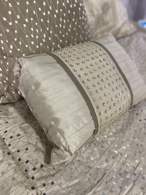 Update your bedroom with the alluring style of the Lillian 8 Piece Embroidered Comforter Set. The faux silk pieced comforter and shams flaunt a geometric embroidery design that adds charm and texture to the top of the bed. Two polyoni Euro shams provide a rich color to the bedding set, while a coordinating bed skirt offers a clean and crisp finish. Decorative pillows feature embroidered details that help complete the ensemble.