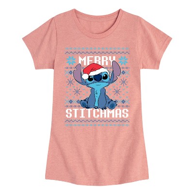 Lilo & Stitch - Mele Kalikimaka - Girls Fitted Short Sleeve Tee - Celebrate the ohana with Lilo & Stitch graphic apparel, blending new visuals with classic heartwarming moments featuring Lilo, Stitch, and the bonds of family.
