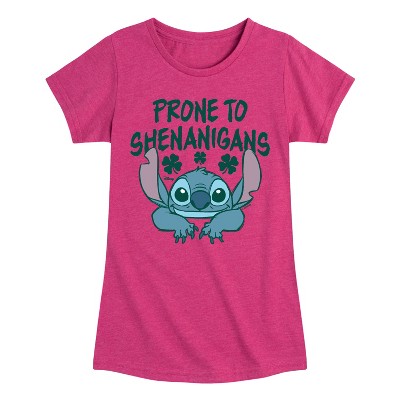 Lilo & Stitch - Prone To Shenanigans - Girls Youth Fitted Short Sleeve Graphic T-shirt - Celebrate the ohana with Lilo & Stitch graphic apparel, blending new visuals with classic heartwarming moments featuring Lilo, Stitch, and the bonds of family.