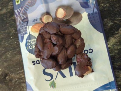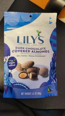 I purchased this bag if Lily's Dark Chocolate Covered Almonds as a treat. So good! No added sugar. Sweetened with Stevia. Crunchy. Dusted in cocoa. Highly recommend.