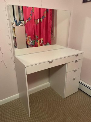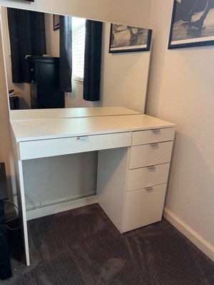 [This review was collected as part of a promotion.] The Polifurniture Linden Bedroom Vanity with Mirror is a good vanity. There is a lot of space in the drawers. The mirror is a great size. It was not the easiest to put together. There were missing stickers on the pieces. The wood material could be a better quality. We have other products with similar material and it can easily chip and stain. It does look nice in the space and will get a lot of use out of.