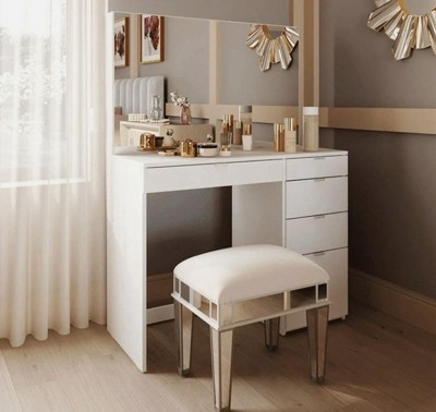 Add extra storage and style to your bedroom with the Linden Makeup Vanity Table from Polifurniture. This vanity has a modern design and the solid white finish will fit with a variety of bedroom decors. It is constructed from engineered wood with a durable and resistant melamine finish to protect against everyday use. The large mirror and spacious table top provide the perfect place to get ready for your day or a fun night out. The multiple storage options will keep all your personal belongings neat and organized. There five drawers on ball bearing glides in various size and the bottom drawer is deeper making it perfect for larger or taller items. With its modern design, large mirror and tons of storage options the Linden Makeup Vanity Table is perfect for any bedroom.