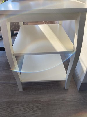 I bought this as an end table for a bedroom. It is cute and the perfect size. It is level with a full-size bed and big enough for a lamp and iPod station. It came in white just as pictured. It is very easy to put together.