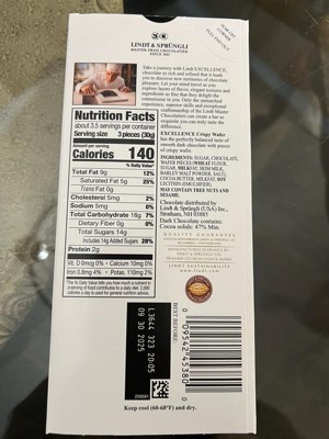 Dive into the richness of Lindt EXCELLENCE Crispy Wafer Dark Chocolate. EXCELLENCE Crispy Wafer Dark Chocolate Bar reveals the intensity of smooth dark chocolate with pieces of crispy wafer. Each bar is pre-portioned into squares for balanced complexity. The sophisticated flavors in this dark chocolate candy bar make this gourmet chocolate perfect with after-dinner drinks. Give this premium dark chocolate bar as gift, or use them as baking chocolate. Lindt chocolate is masterfully crafted with the highest-quality ingredients from world-renowned regions. *Information online not complete; check label of actual product being purchased.*