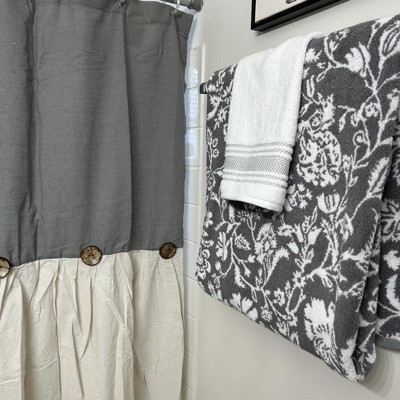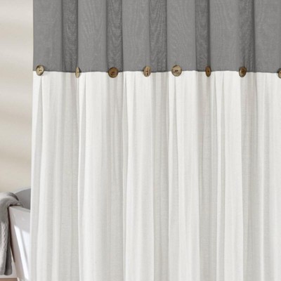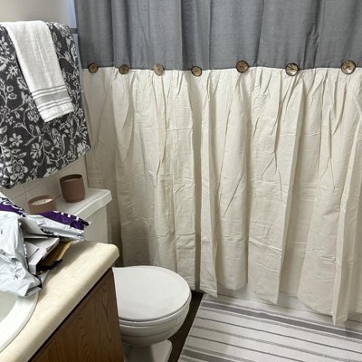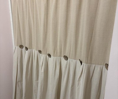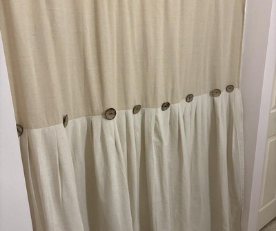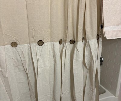 Add the look of linen to your to your home with the Linen Button Shower Curtain. Featuring a pleated color block design and coconut button details, this charming bath curtain adds style and texture to your home. This bathroom curtain is crafted from a linen-textured cotton fabric blend of 52% Polyester, 37% Cotton, and 8% Viscose. The coconut husk button details add a handcrafted, rustic feel your space. These fabric shower curtains for bathroom are the perfect addition to your modern farmhouse, country, or coastal styled bathroom. Sold as a single bath curtain, this farmhouse shower curtain measures 72" W x 72" L. The 12 button holes at the top of this shower curtain make it easy to hang with hooks or rings, ensuring a simple installation process. Because this is a fabric shower curtain, we recommend pairing it with a liner, sold separately. Caring for this cotton shower curtain is easy, simply machine wash cold on the gentle cycle, and tumble dry on low. If needed, use an iron on low heat to remove wrinkles or a non-chlorine bleach for cleaning.