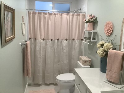 My daughter chose this curtain for her bathroom, due to the pink color. In real life, it's not as pink as we thought so it's slightly different than her rugs. The bottom is not white either, it's more like a heather oatmeal color. The button detail is a nice touch though and this curtain is more interesting and unique than others. Much better deal than others too! She likes it.