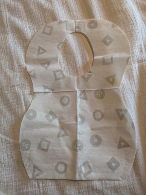 I'm adding this to my diaper bag and to my list of go-to baby shower gifts. These have a Velcro strap at the neck that was sturdy and secure along with a crumb pocket. They are soft like a wipe but not absorbent so my daughter's clothes stay dry. They fold up soooo small and I love being able to toss them after use. They are perfect for restaurants. I used to bring a reusable smock and put it in a ziplock but it always got so gross. These are a great solution!