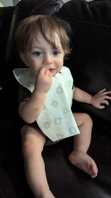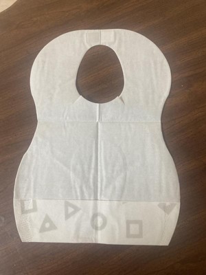 These disposable bibs so great to have on hand, perfect for eating out or visiting family and friends. The bibs have Velcro on top, are soft, and the bottom portion flips to create a pocket to catch any fallen food. Design is cute and neutral.