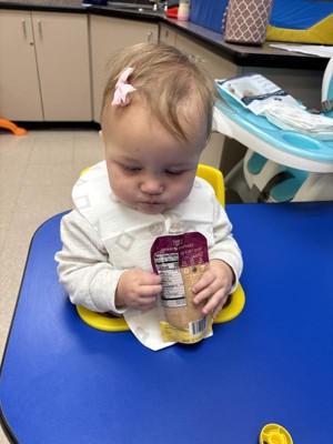 These are great for on the go. They are so soft on one side and a plastic side on the other, there’s a pouch at the bottom to get the falling food. They have Velcro to stick them together and it’s so strong. I would buy these again and again.