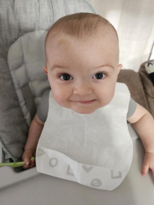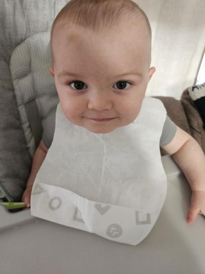 This was my first time trying disposable bibs and I love how easy they were to use. These are perfect to take on the go. I've used them for eating out and traveling and also for eating when out at family parties. I like that they are light weight and my baby keeps them on. They have a pocket to catch crumbs and work well at keeping my baby clean.