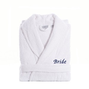 This terry cloth bath robe is made for a luxurious experience. It is soft to the touch and highly absorbent -- helping you dry off with style, elegance, and comfort. Like all of our products, these robes are woven from thick, soft, 100% genuine Turkish cotton; they are exceptionally soft and become even softer after every wash. This robe is custom made, embroidered with the word "Bride" in navy.