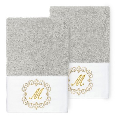 The Monica Embellished Towel Collection features an elegant metallic crest motif with your monogram embroidered on a crisp white border. These soft and luxurious towels are made of 100% premium Turkish Cotton and offer lasting absorbency and superior durability.