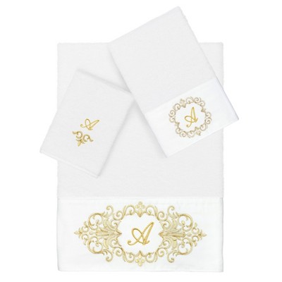 The Monica Embellished Towel Collection features an elegant metallic crest motif with your monogram embroidered on a crisp white border. These soft and luxurious towels are made of 100% premium Turkish Cotton and offer lasting absorbency and superior durability.