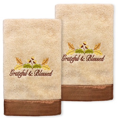 Your Holiday party decorations are not complete without enchanting embroidered hand towels for the joy of your family and guests. T an embroidered festive phrase, leaves and metallic berries and are trimmed with a matching lustrous border. Cloud soft and super absorbent, these luxurious, durable terry hand towels keep their plush appearance after washing. The GATHER hand towels bring an elegant, lavish spirit and comfort to your home decor and make a considerate gift!