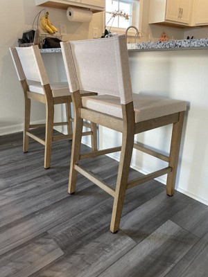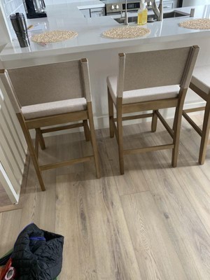 A: Hi! Thank you for reaching out to us about this! For our Linus Bar Stool Dark Brown/Light Gray Linen (21502), the color of the wood is closer to what is shown in the swatch. You can view additional swatches and pictures here:https://nathanjames.com/products/wood-upholstered-sling-back-counter-height-bar-stool.