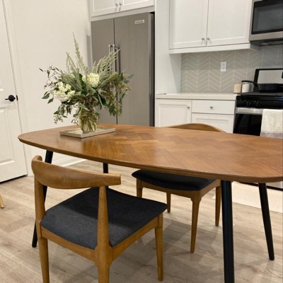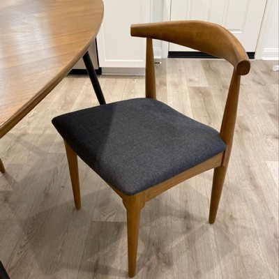 Sleek, midcentury modern design made of solid wood. Purchased at a great price because Target honored the competitor’s price and gave me the 5% Red Card holder’s discount. We absolutely love these chairs. Easy to wipe down after messy hands and comfortable to sit in during meal time and early morning studying.