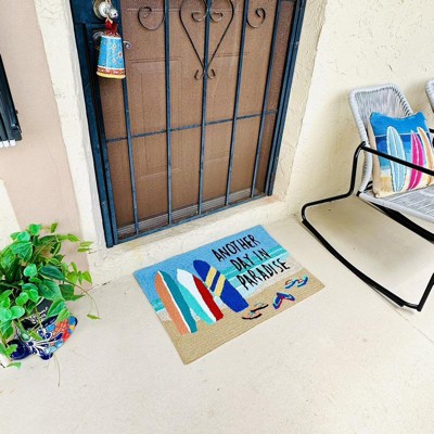 The Van Life doormat features an aqua and white van with bright yellow and orange surfboards atop at the beach against an ocean background.