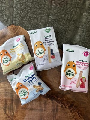 [This review was collected as part of a promotion.] These blueberry puffs are my baby nephews favorite out of all the Little Bellies. They were the perfect size snacks between feeding. We didn't have to worry him choking because they dissolved. He just couldn't get enough of them.