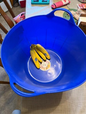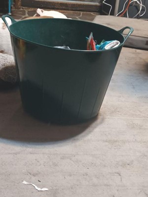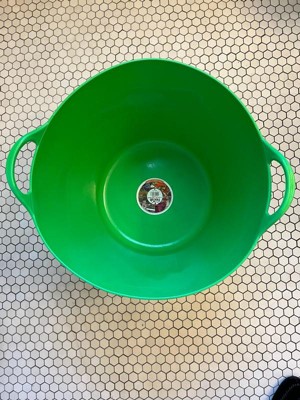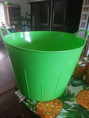[This review was collected as part of a promotion.] This is a very large very durable tub/bucket. It could be used for a variety of purposes. I like the color. It’s easy to hold with the handles. The material is flexible but still sturdy.