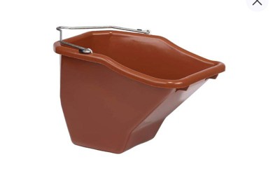 Tapered sides funnel feed toward the back of the bucket, making feed and grain more accessible without the animal having to strain in an awkward position. The flat-back style provides stability against a wall or fence. This feed bucket mounts on a flat wall with either a traditional wall bracket or snap hook (not included). It features a durable, impact-resistant, high-density polyethylene construction with smooth, finished edges. The heavy-duty metal handle is notched for hanging. This feed bucket measures 20 inches long by 16 inches wide by 14 inches high and holds 20 quarts (5 gallons). For more information, go to https://www.p65warnings.ca.gov/