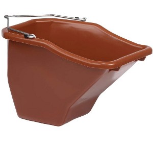 Tapered sides funnel feed toward the back of the bucket, making feed and grain more accessible without the animal having to strain in an awkward position. The flat-back style provides stability against a wall or fence. This feed bucket mounts on a flat wall with either a traditional wall bracket or snap hook (not included). It features a durable, impact-resistant, high-density polyethylene construction with smooth, finished edges. The heavy-duty metal handle is notched for hanging. This feed bucket measures 20 inches long by 16 inches wide by 14 inches high and holds 20 quarts (5 gallons).