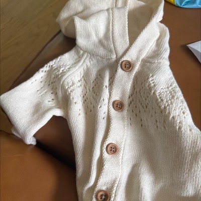 [This review was collected as part of a promotion.] This is such a cute piece! I love how the buttons look like wood and the material is really cozy, organic cotton. The little hood is super cozy and the cuffs are the perfect size and length. Washing is not too complicated with a delicate cold wash. However, the one downside is that there are no snaps at the legs which makes diaper changing tedious.